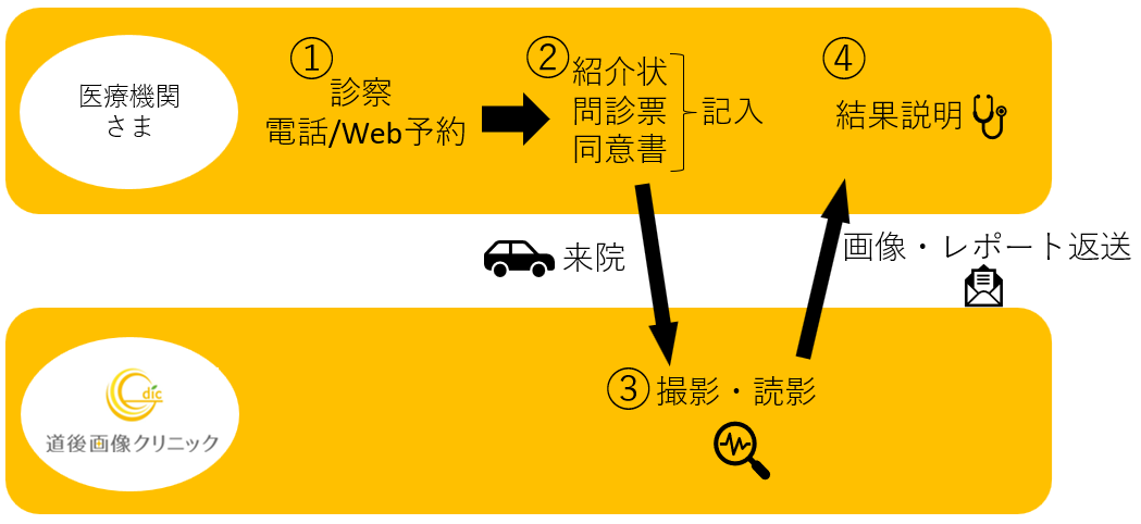 ③当院にて撮影・読影を行い、画像・レポートを返送いたします。